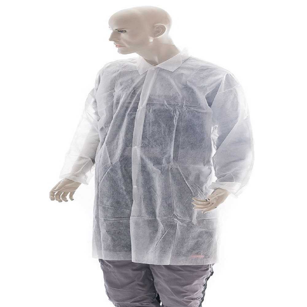 Blouse jetable en polypropylène, avec boutons-pression, sans poches.
