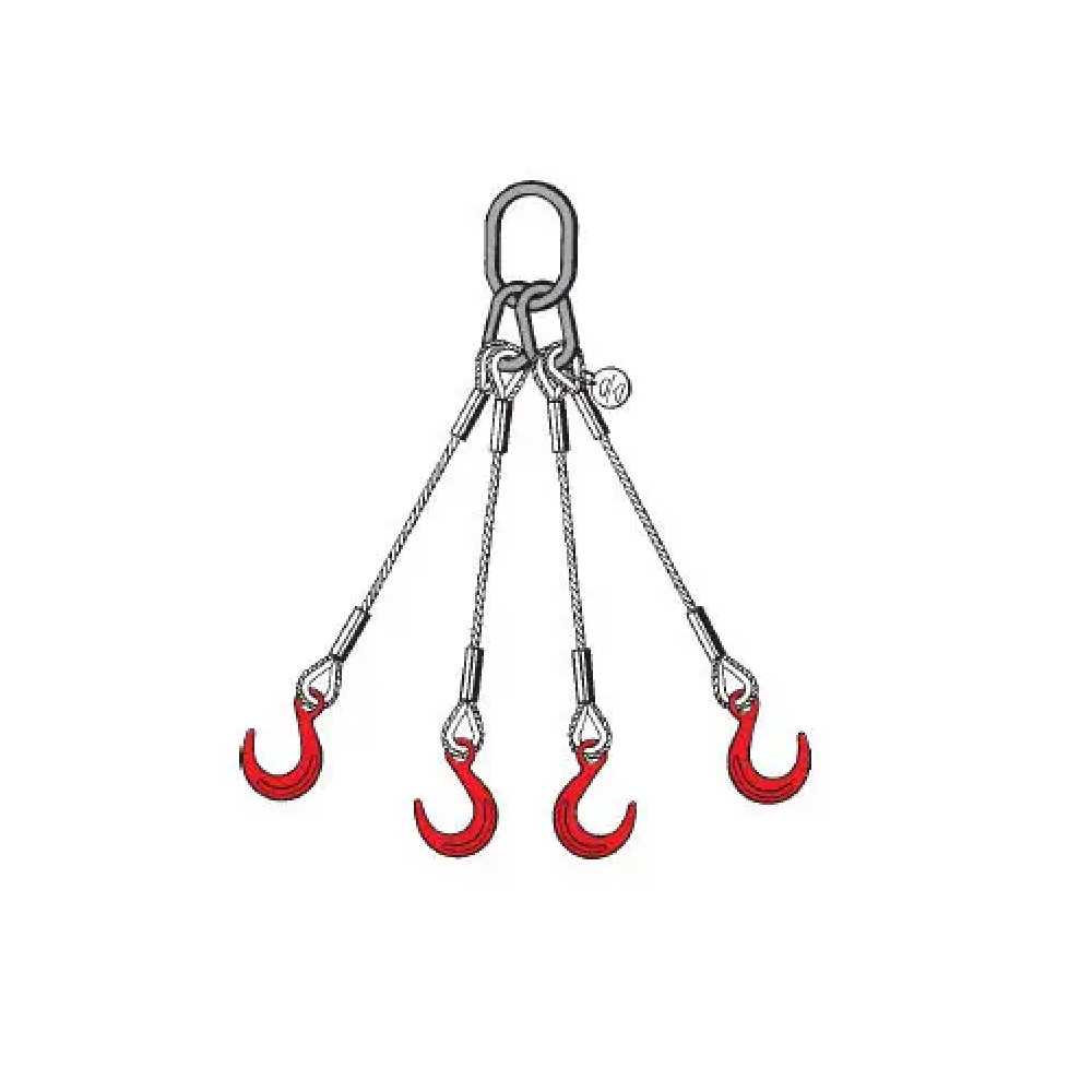 Les élingues en câble métallique à 4 brins sont constituées d'un œillet flamand épissé par manchon, virole et cosse. Les brins de l'élingue à brides peuvent être assemblés avec des mailles maîtresses G80, des crochets forgés, des manilles ou tout autre accessoire souhaité.
