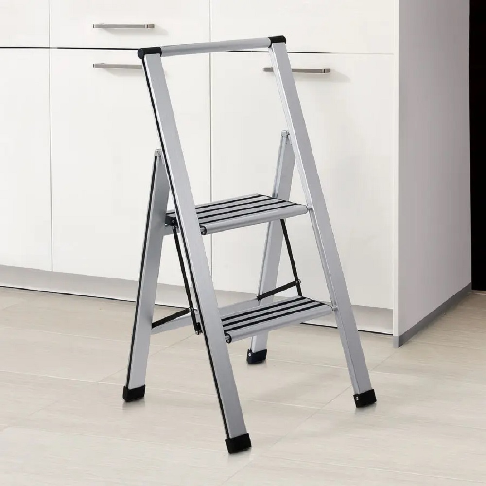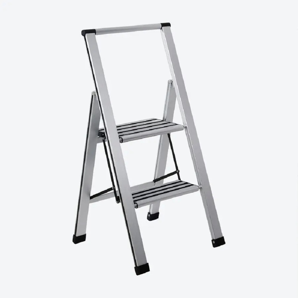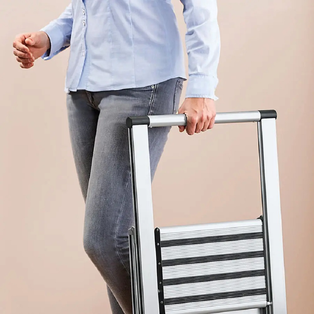 Les marches extra larges avec profil antidérapant, la bonne stabilité et le garde-corps garantissent une sécurité maximale. Replié d'un geste, cet escabeau léger mais stable ne fait plus que 5,5 cm et entre dans le plus petit espace de rangement. Structure en aluminium très résistante avec plastique, marches 31,5 x 14,5 cm, plateau supérieur 31,5 x 23 cm, hauteur de la plus haute marche 53 cm, charge maximale 150 kg, sécurité contrôlée.