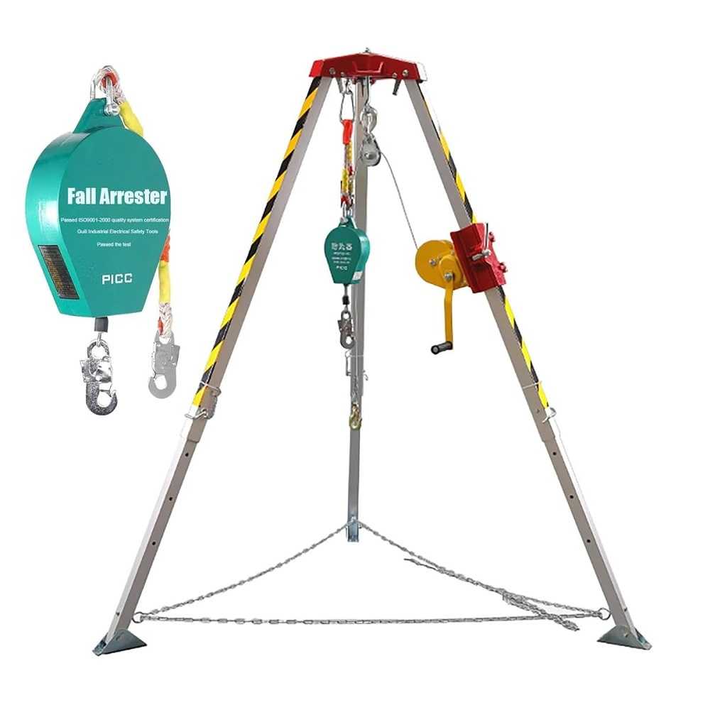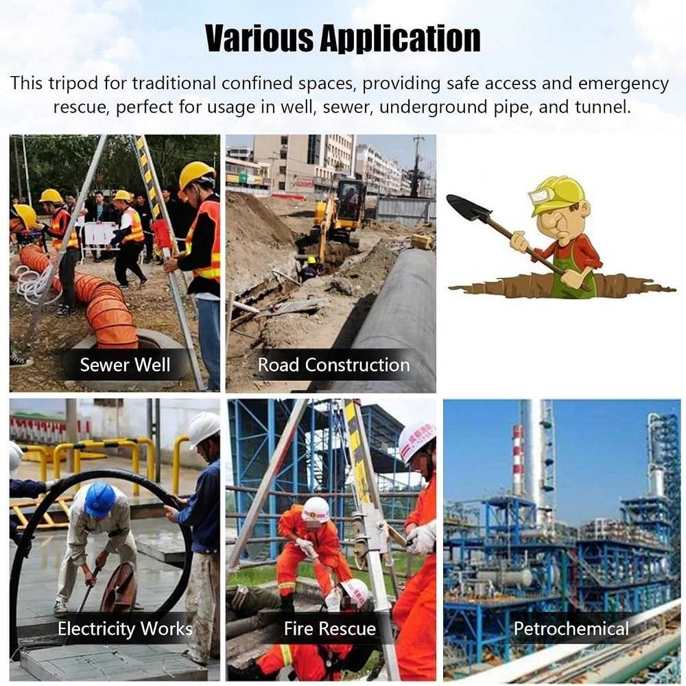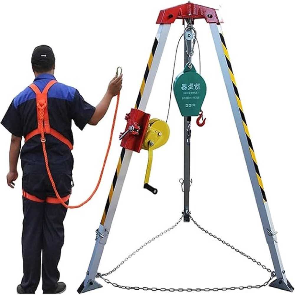 - Large utilisation -> le trépied avec treuil de sauvetage convient à l'entrée et au sauvetage dans des espaces confinés tels que les puits, les égouts, les canalisations souterraines et les tunnels. Livré avec deux sacs de transport.