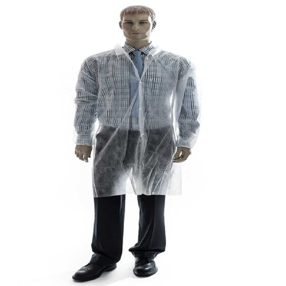 Blouse jetable en polypropylène, avec boutons-pression, sans poches.