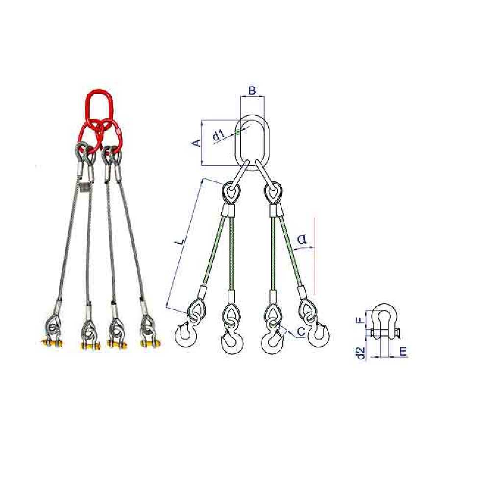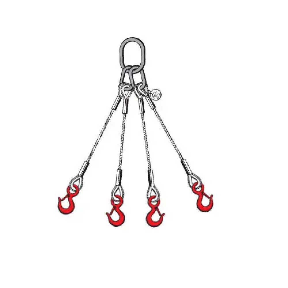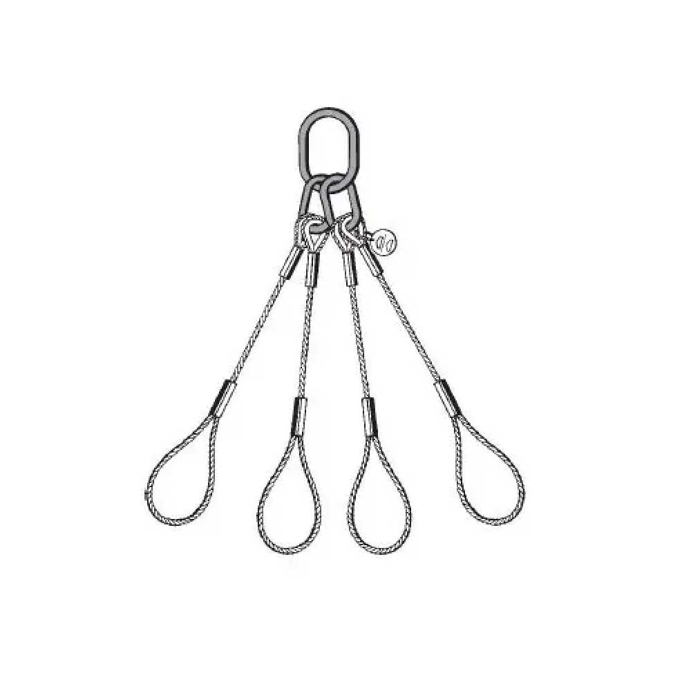 Les élingues en câble métallique à 4 brins sont constituées d'un œillet flamand épissé par manchon, virole et cosse. Les brins de l'élingue à brides peuvent être assemblés avec des mailles maîtresses G80, des crochets forgés, des manilles ou tout autre accessoire souhaité.