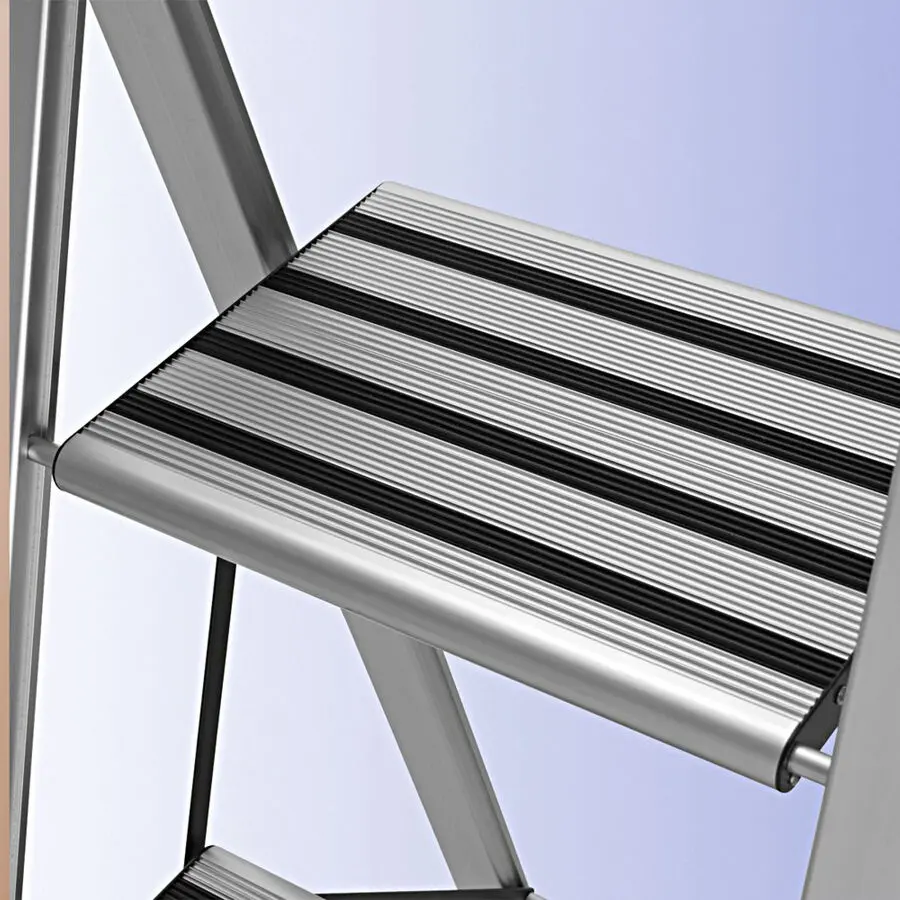 Les marches extra larges avec profil antidérapant, la bonne stabilité et le garde-corps garantissent une sécurité maximale. Replié d'un geste, cet escabeau léger mais stable ne fait plus que 5,5 cm et entre dans le plus petit espace de rangement. Structure en aluminium très résistante avec plastique, marches 31,5 x 14,5 cm, plateau supérieur 31,5 x 23 cm, hauteur de la plus haute marche 53 cm, charge maximale 150 kg, sécurité contrôlée.